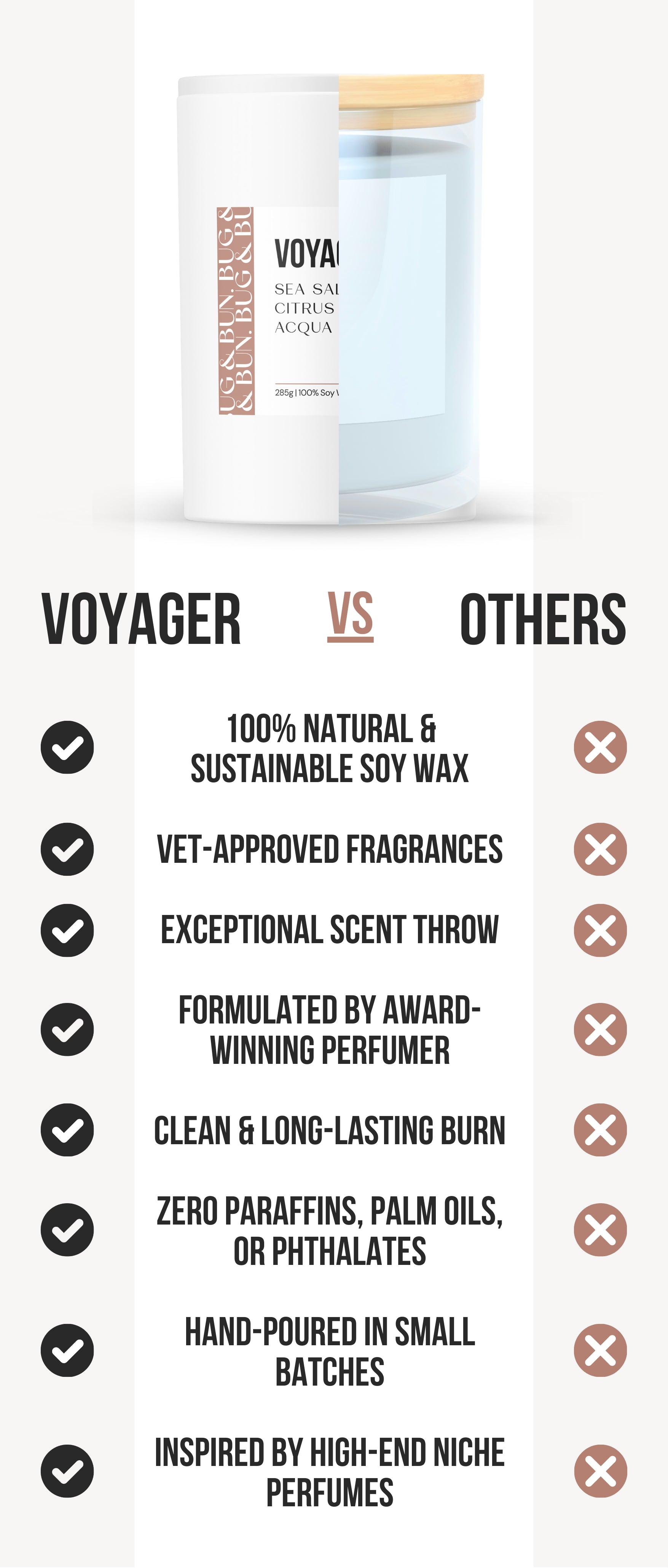 This Voyager candle is made using 100% natural eco soy wax and vet-approved, Premium Fragrance oils to ensure a safe burn and excellent scent throw.