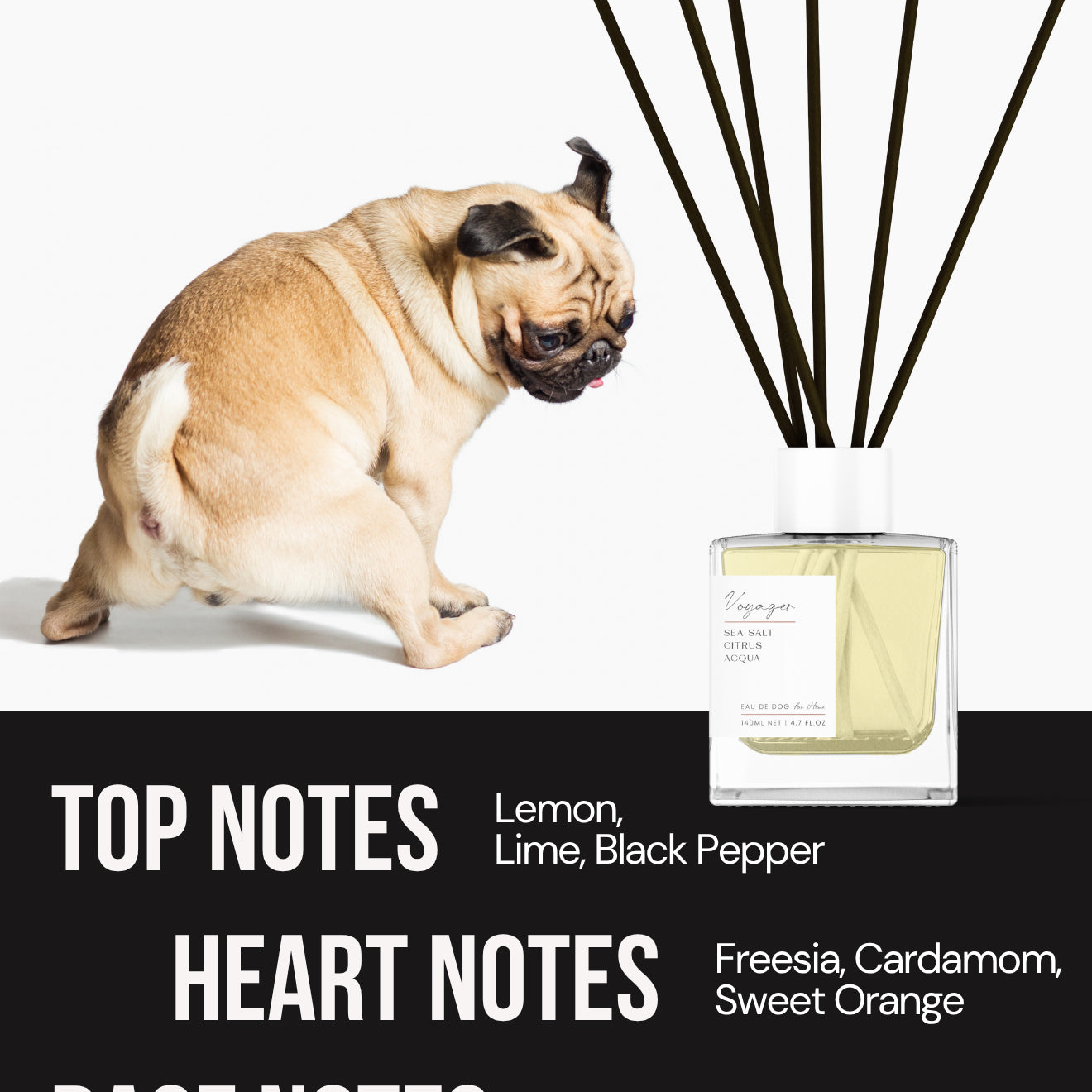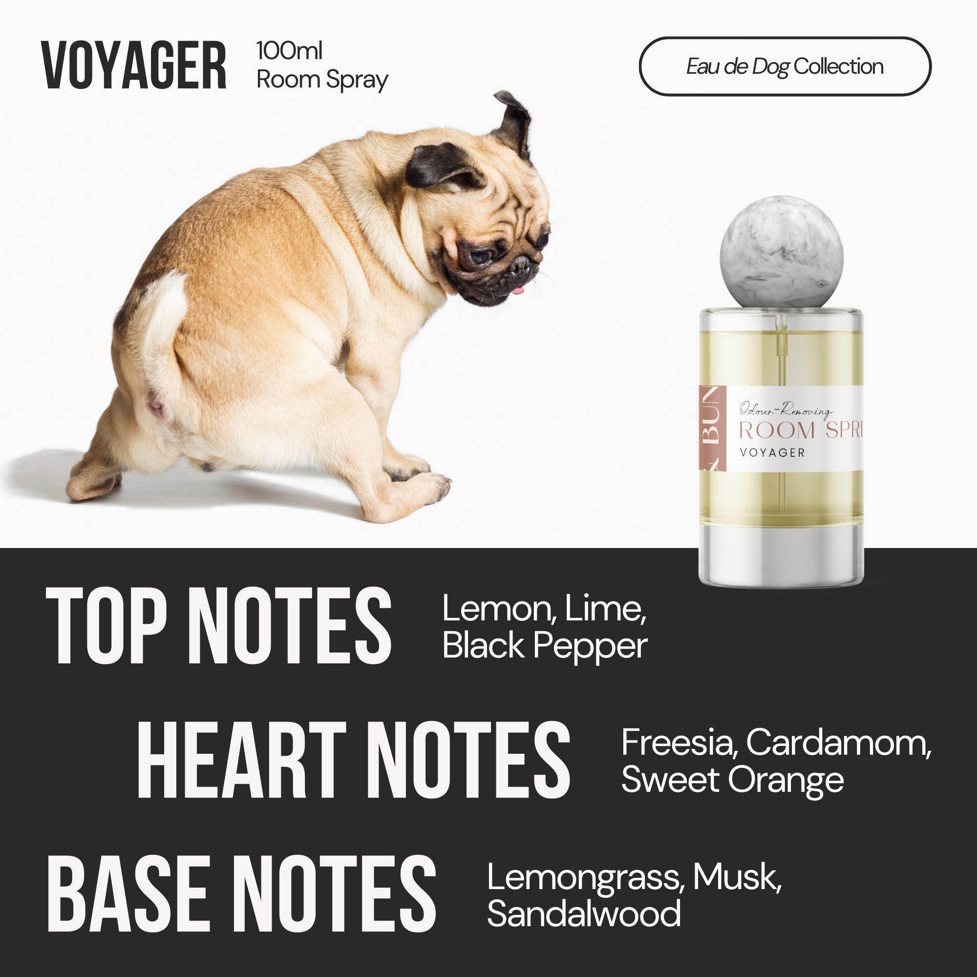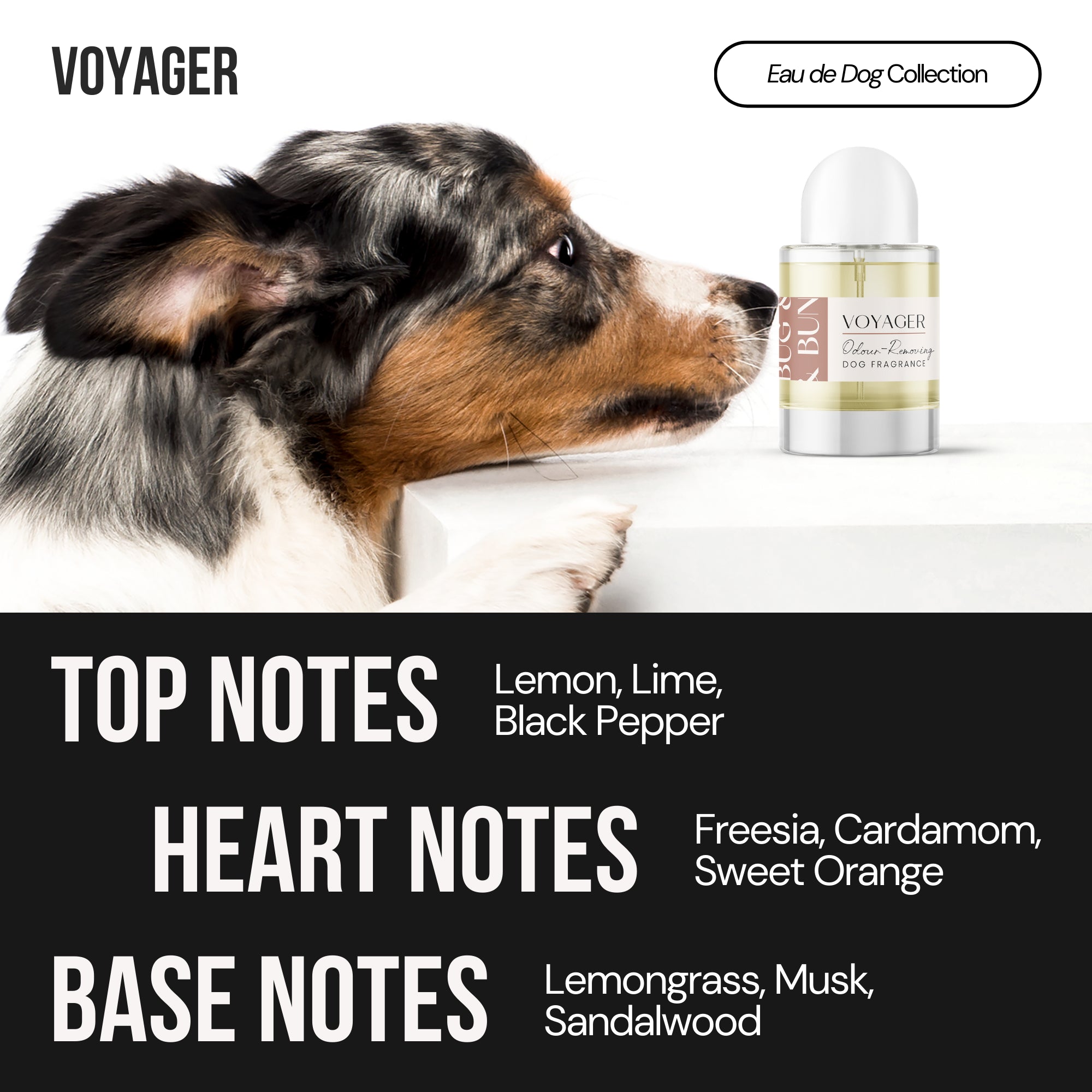 With bright top notes of lemon, lime, and black pepper; a heart of sweet orange, cardamom, and freesia; and a grounding base of creamy sandalwood, lemongrass, and soft musk—Voyager is formulated to remove dog odour while filling your space with crisp, sunlit serenity.