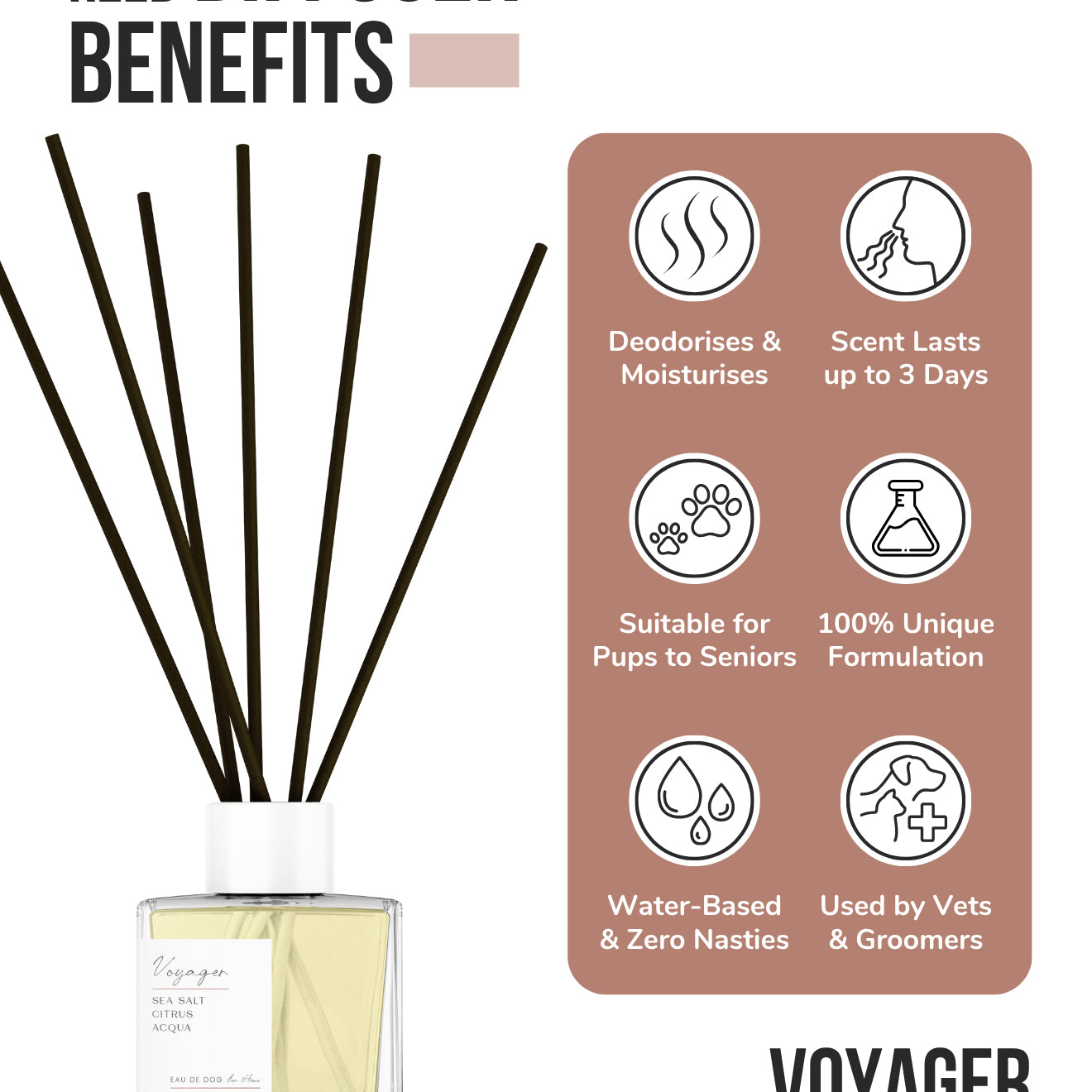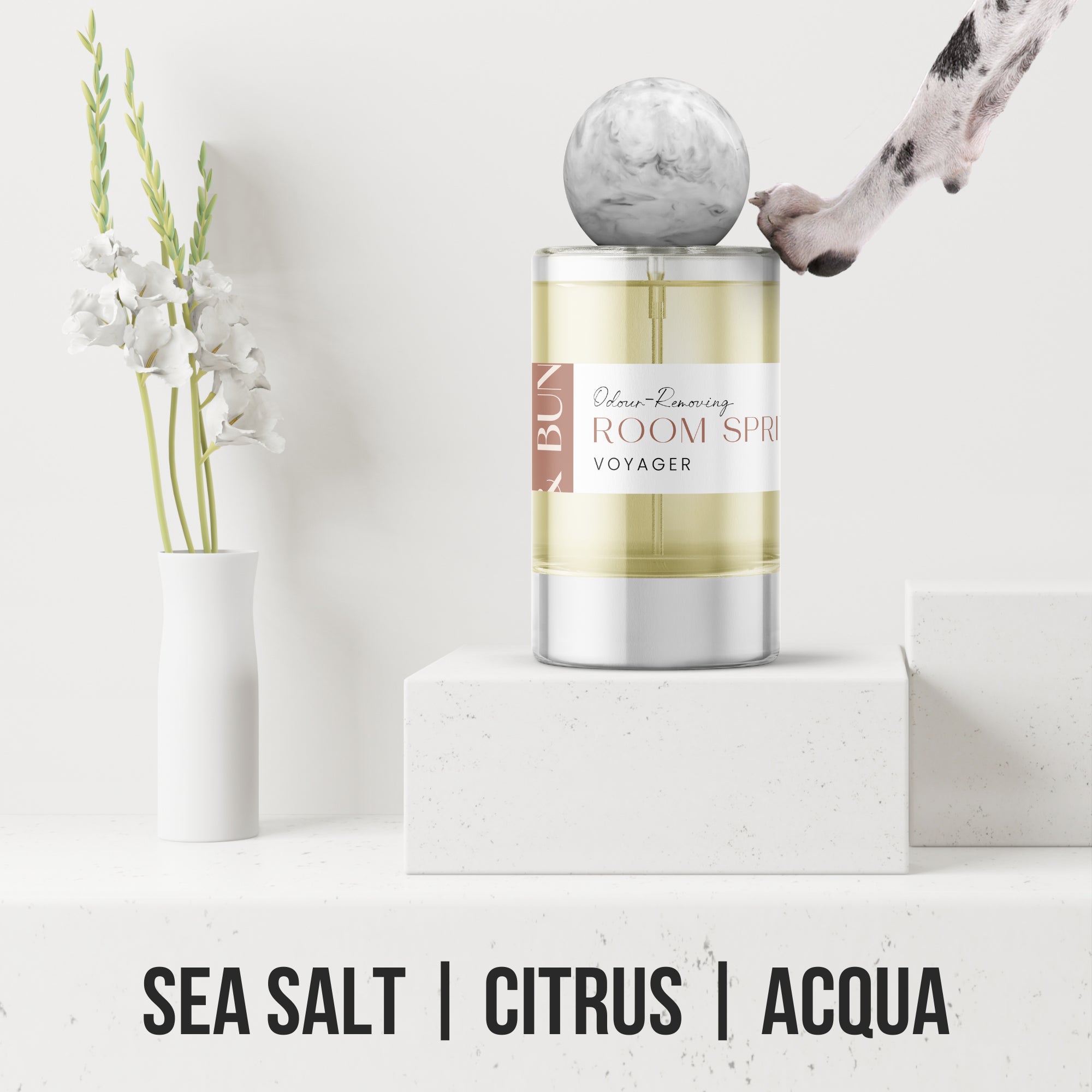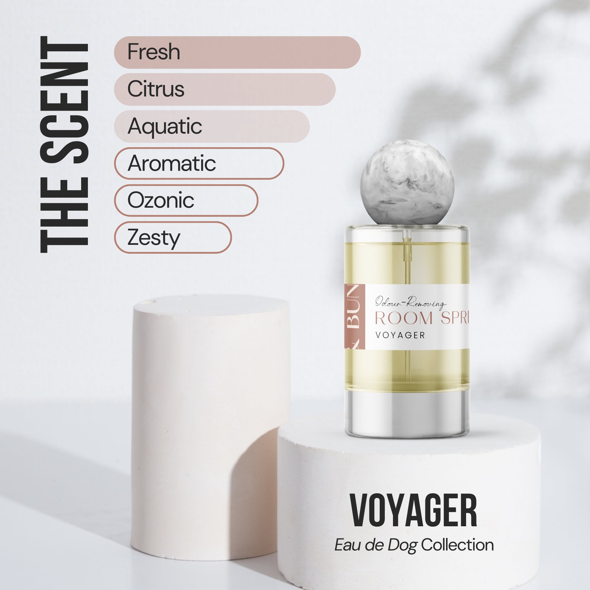With bright top notes of lemon, lime, and black pepper; a heart of sweet orange, cardamom, and freesia; and a grounding base of creamy sandalwood, lemongrass, and soft musk—Voyager is formulated to remove dog odour while filling your space with crisp, sunlit serenity.