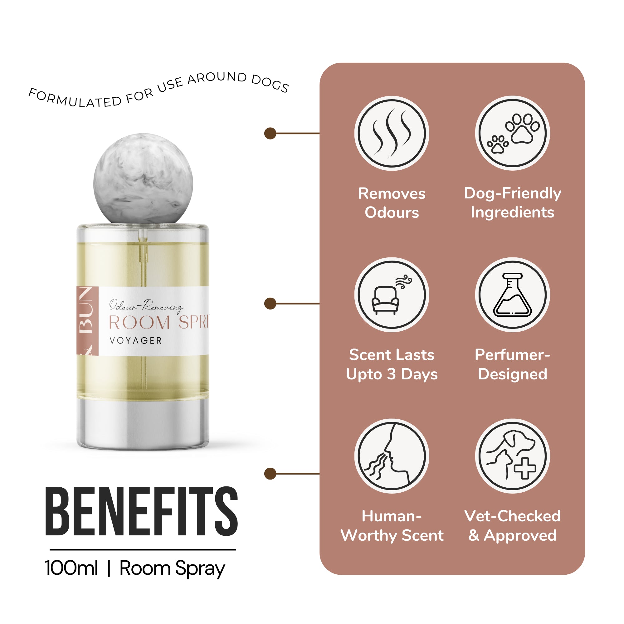 Yes, Voyager Room Spray is designed to remove dog odour—not just mask it—with a beautiful blend of dog-friendly ingredients that refresh soft furnishings and the air in your home.