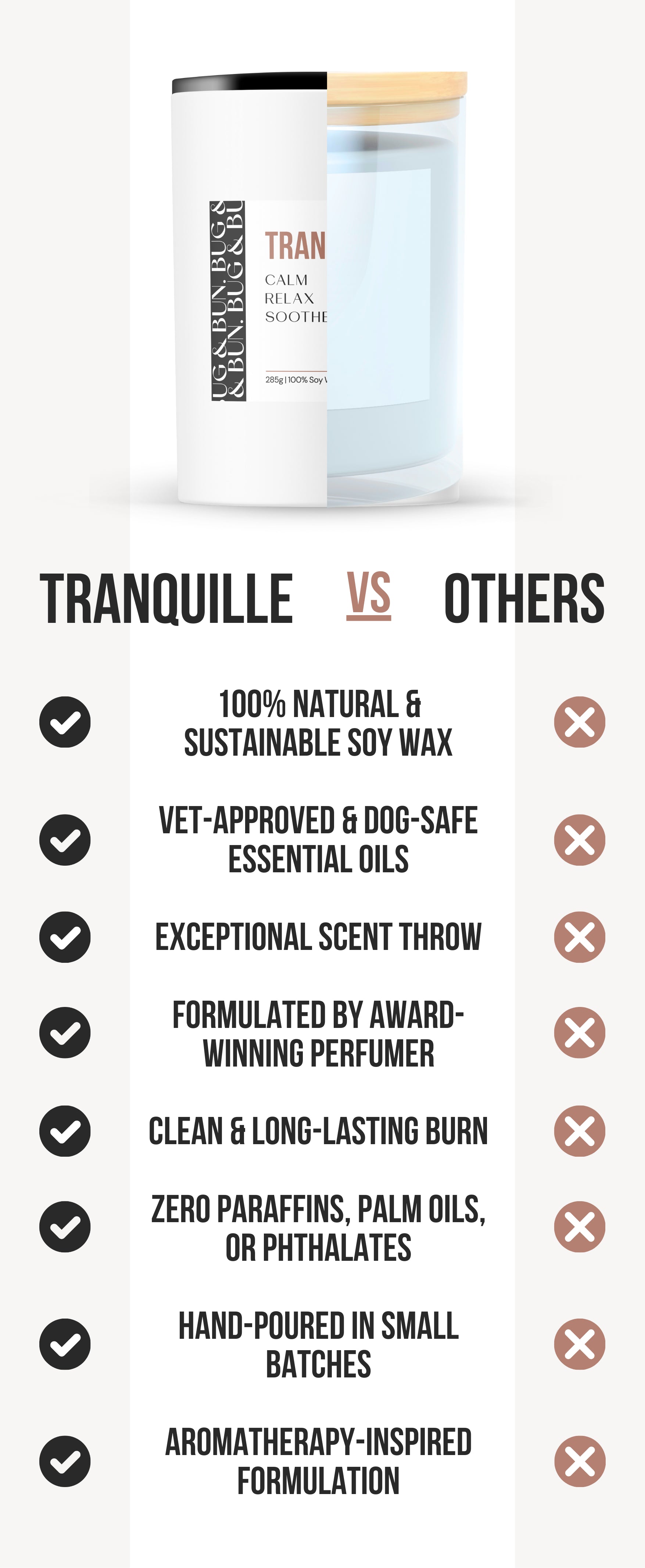 Our Tranquille candle is designed specifically for use around humans and dogs, and is made with dog-safe essential oils and natural soy wax.