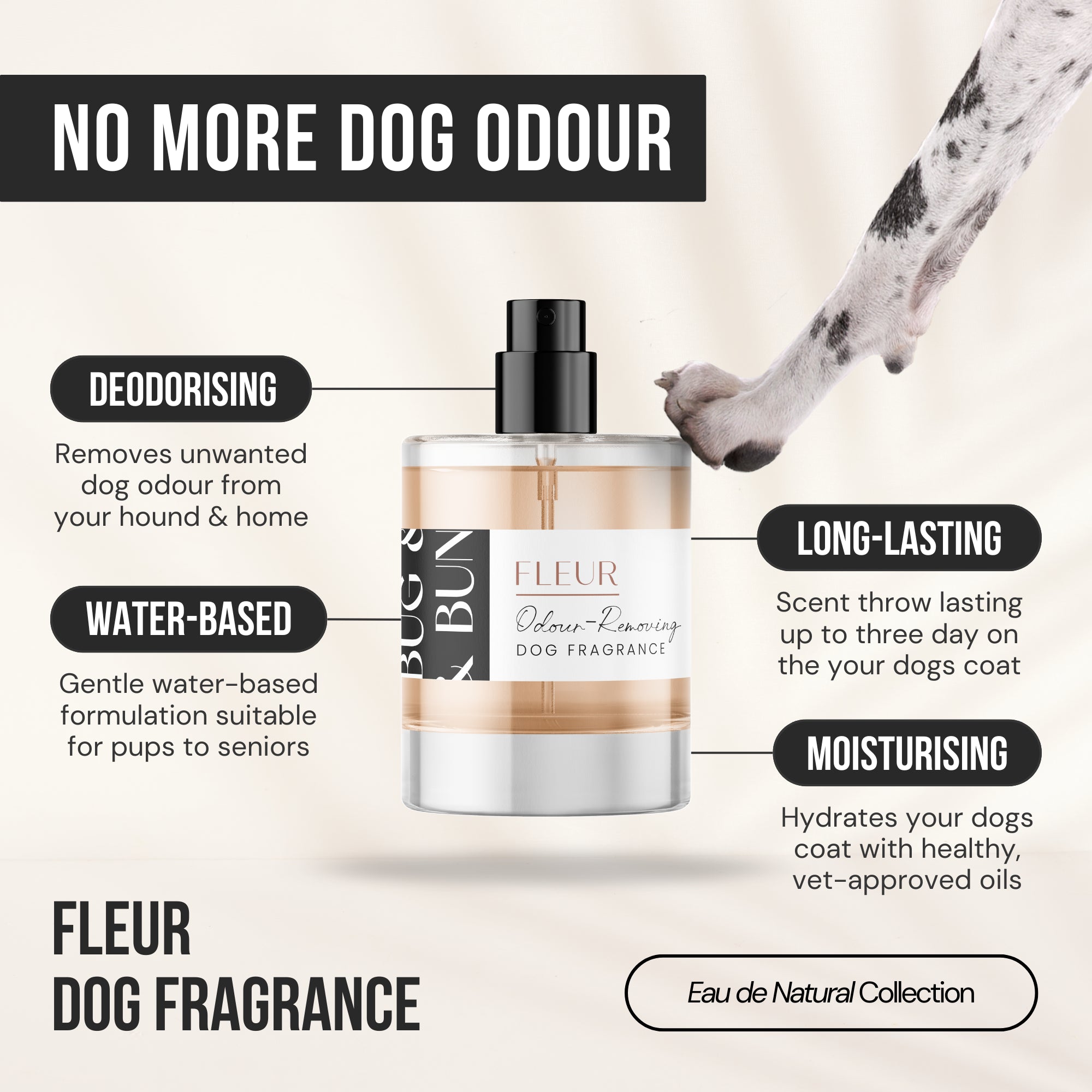 Spritz your Fleur Dog Fragrance here if you want delightful smelling couch cuddles and a luxurious and elegant pooch.